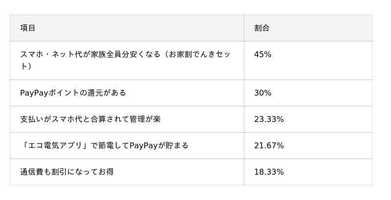 - 気に入っているポイントとして、45%が「家族全員のスマホ・ネット代が安くなること」、30%が「PayPayポイント還元」を挙げている。電気代単体だけでなく、通信費を含めたトータルコストの削減にメリットを感じる利用者が多いとわかった。