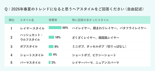 また、昨年は「重めスタイル」や「まとまりのあるボブ」も上位にランクインしていましたが、2026年春夏は韓国トレンドやY2Kブームの影響を受け、「ハッシュカット」や「ウルフスタイル」が第2位に浮上しました。