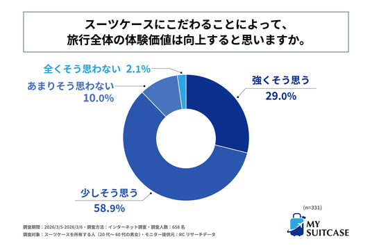 次に、こだわりをもって選んだスーツケースを所有する人を対象に「スーツケースにこだわることによって、旅行全体の体験価値は向上すると思うか」を尋ねる設問への回答では、1位が「少しそう思う」で58.9%、2位が「強くそう思う」で29.0%、3位が「あまりそう思わない」で10.0%という結果になりました。1位と2位の各回答の比率を合計すると87.9%となり、この結果から、こだわりをもって選んだスーツケースを所有する人の約9割が、スーツケースにこだわることによって旅行全体の体験価値が、程度の差こそあれ、向上すると考えていることが判明しました。