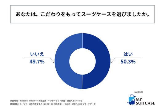 まず、「こだわりをもってスーツケースを選んだか」を尋ねる設問への回答では、「はい」が50.3%、「いいえ」が49.7%であるという結果になりました。この結果から、スーツケースを所有する人の約半数が、こだわりをもってスーツケースを選んだことが明らかになりました。