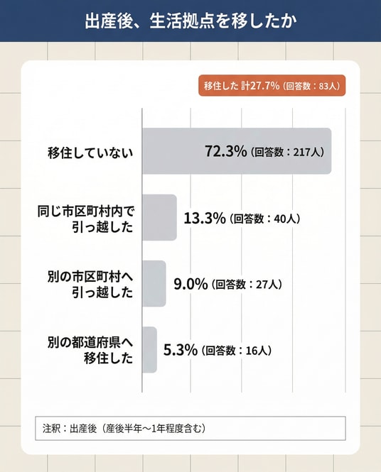 出産時に実家へ戻る人が多い一方で、産後に恒常的な移住まで行う人は27.7%(83人)に留まり、生活基盤(仕事・保育・人間関係)を維持する志向が強い可能性があります。