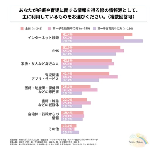 妊娠や育児に関する情報を得る際の主な情報源は「インターネット検索」「SNS」「家族・友人など身近な人」だが、第一子を妊娠中の女性はその約半数が「育児関連アプリ・サービス」も情報源にしている