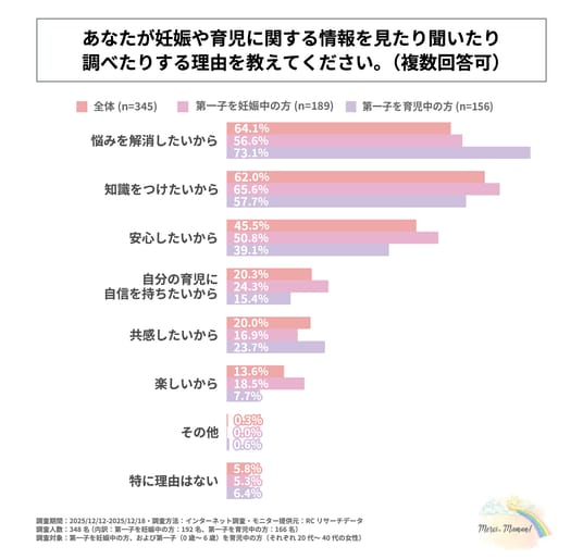妊娠や育児に関する情報を見たり聞いたり調べたりする主な理由は「悩みを解消したいから」「知識をつけたいから」「安心したいから」