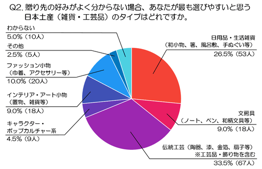 - 次いで多かったのが、「日用品・生活雑貨(和小物、箸、風呂敷、手ぬぐい等)」の26.5%(53人)でした。毎日の暮らしの中で使いやすいものは、実用性があり、相手にも受け入れられやすい傾向があります。和の雰囲気を感じられながらも、日常になじみやすい点が魅力であり、気負いすぎずに贈れるジャンルとして支持されていることがうかがえます。