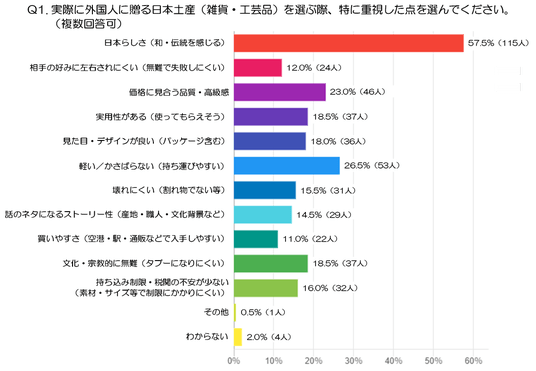1.Q1:実際に外国人に贈る日本土産(雑貨・工芸品)を選ぶ際、特に重視した点を選んでください。(複数選択可:注1)