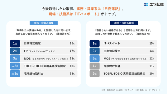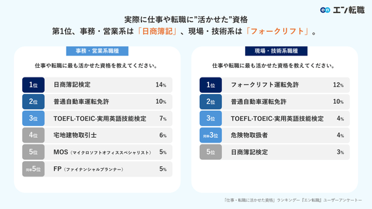 実際に仕事や転職に”活かせた”資格第1位、事務・営業系は「日商簿記」、現場・技術系は「フォークリフト」。