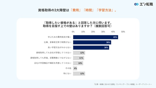 今後取得したい資格がある方に、取得を目指す上での壁を伺うと、上位は「学ぶための費用負担が重い」(45%)、「仕事・家事育児などで時間がない」(38%)、「良い学習方法が分からない」(36%)でした。