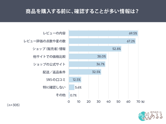 また「ショップ(販売者)情報」(52.8%)や「他サイトでの価格比較」(38.0%)なども確認されており、複数の情報を組み合わせて判断する傾向が見られます。