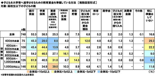高校生以下の子どもの親(748名)に、大学等への進学のための教育資金を、どのような方法で準備しているか聞いたところ、「銀行預金」(53.3%)が最も高くなり、「学資保険」(38.5%)、「資産運用(株式投資、投資信託、NISAつみたて投資枠等)」(25.3%)が続きました。