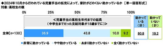 高校生の親(130名)に、≪児童手当の高校生年代までの延長(中学生までだった支給対象が18歳までに)≫によって家計がどのくらい助かっているか聞いたところ、「助かっている(計)」は80.8%、「助かっていない(計)」は19.2%となっており、大多数が家計の負担軽減を実感しているようです。 (図26)