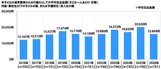 ・子どもの進学費用のための備え 平均支出金額は15,684円/月、昨年調査から4,355円減少