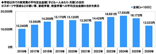 ・学校外教育費の平均支出金額は12,022円/月、昨年調査から4,150円の大幅減少