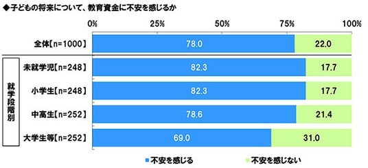 全回答者に、子どもの将来について、教育資金に不安を感じるか聞いたところ、「不安を感じる」は78.0%、「不安を感じない」は22.0%と、多数が不安を感じている結果となりました。