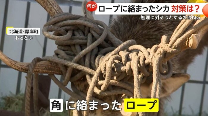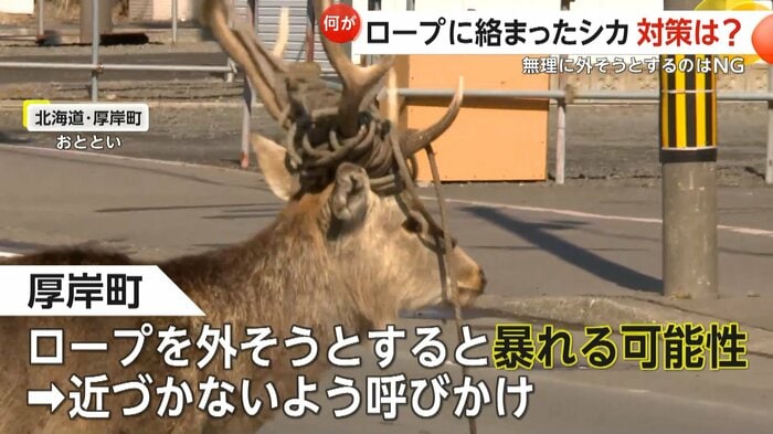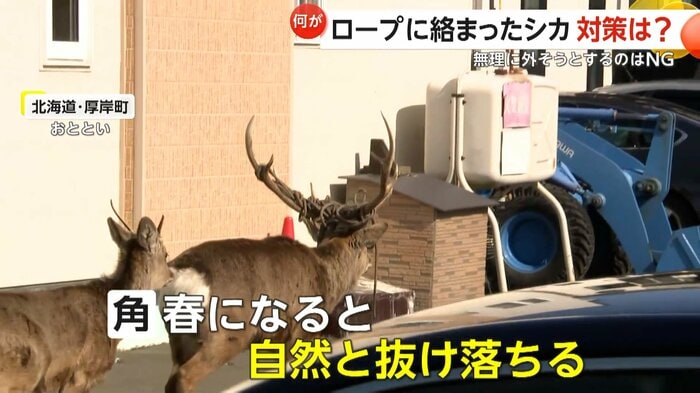 町民は「みんなシカよけのネットを庭に張っている。そのネットに突っ込んで絡んだんじゃないかな」、「どうにかしないと。ロープを取ってやろうと思っているが全然ダメ」と話している。
