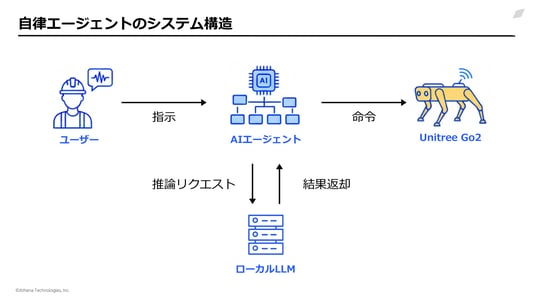 現場作業員の発した音声指示は、まず閉域環境内の音声認識モデルによってテキスト化されます。その内容は、ローカルLLMへ送られ、AIエージェントが指示内容を解釈。AIがロボットを操作するための最適なコマンドを即座に生成することで、「声」による指示スタイルを実現します。