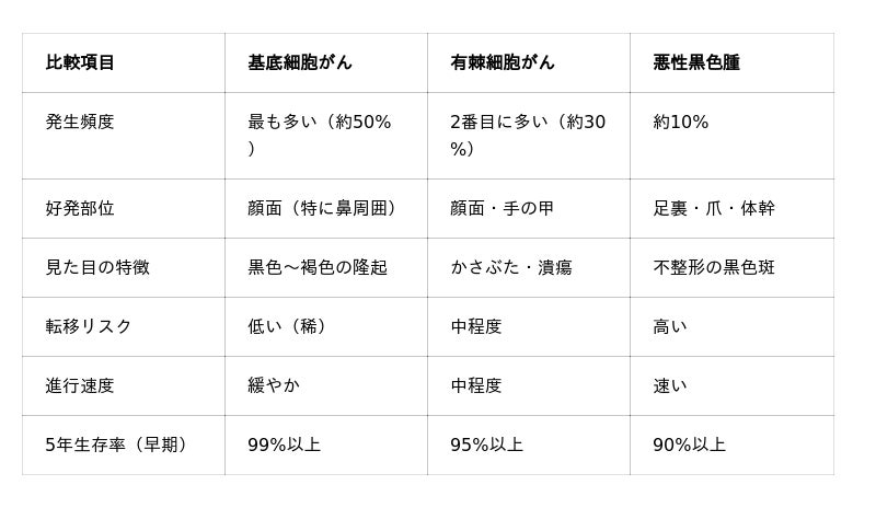 調査では放置経験者の42.0%が1年以上放置していました。皮膚がんは早期発見であれば日帰り手術で治療が完結することも多いですが、放置により深部への浸潤やリンパ節・他臓器への転移が起こる可能性があります。特に悪性黒色腫は進行が速く、早期と進行期では5年生存率に大きな差があります。「たぶん大丈夫」という自己判断は危険であり、専門的な診察を受けることが重要です。