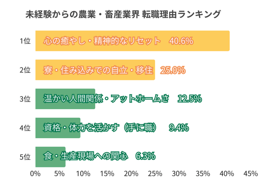 畜産業への転職を希望する未経験者のうち、もっとも多かった理由は「心の癒やし・精神的リセット」でした。