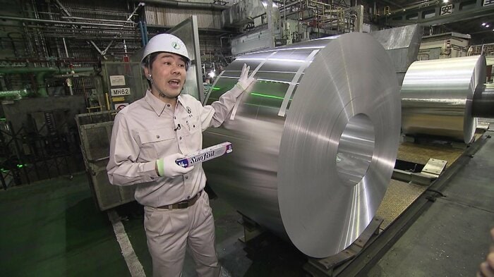 工場に入り、まず目に飛び込んできたのは重さ4トン弱にもなる巨大なアルミ板の塊(アルミコイル)。厚さ0.3mmの原判。サンホイルに換算すると約7万本になるという。