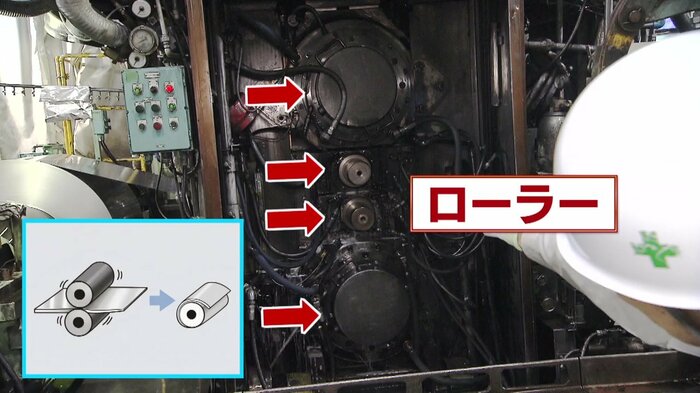 このアルミ板を「圧延機」という機械に通し、何度も何度もローラーで押し延ばして薄くしていく。
