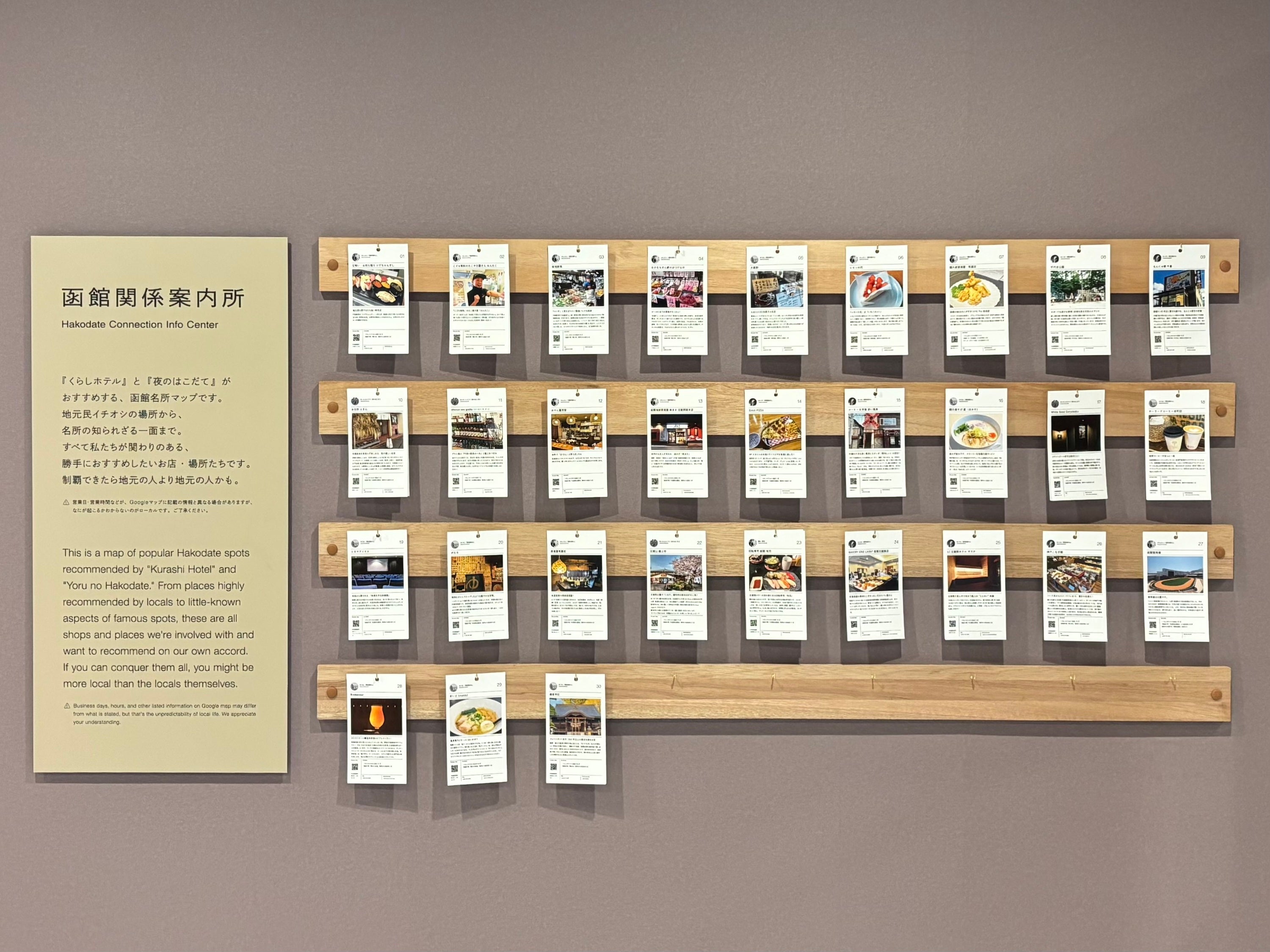 共用廊下に設置したのは、スタッフが実際に足を運んだお店を紹介する「函館関係案内所」のカードです。