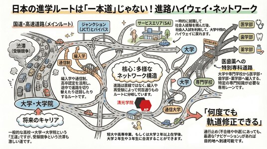 清光学院では、日本の進学制度を複数の進路が交差するネットワークとして整理し、「進学ハイウェイネットワーク」として図解しました。