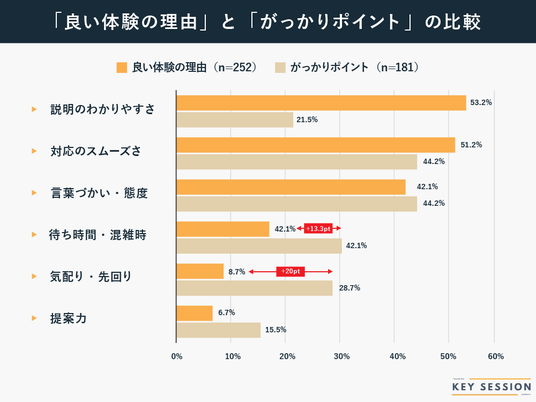 逆に「説明のわかりやすさ」は良い体験では1位(53.2%)にもかかわらず、がっかりポイントでは21.5%(-31.6ポイント)に低下。説明力の高い人は強く評価されますが、多少わかりにくい説明があっても顧客は比較的許容する傾向にあるといえます。