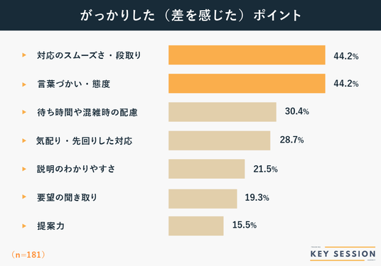 ・がっかりポイントの上位は「対応のスムーズさ・段取り」「言葉づかい・態度」(ともに44.2%)