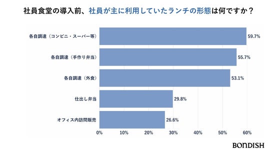 「社員食堂の導入前、社員が主に利用していたランチの形態は何ですか?」という問いに対し、各自調達(コンビニ・スーパー等、手作り弁当、外食)が上位3位を占めていることが分かりました。