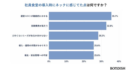 「社員食堂の導入時にネックに感じてた点は何ですか?」という問いに対し、「運営コストが継続的にかかる」が35.7%、「初期費用が高そう」が32.8%となり、全体を通じて費用面に関する回答が上位を占めています。