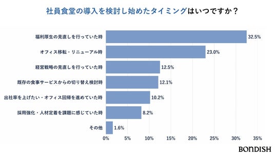 「社員食堂を導入した目的は何ですか?」という問いに対し、「福利厚生の見直しを行っていた時」が32.5%、「オフィス移転・リニューアル時」が23.0%ということが分かりました。前問の導入目的でも福利厚生の比率が高く、社員食堂の導入は福利厚生の観点に重点が置かれています。