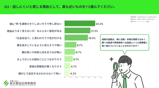 話しにくさの理由としては、「親に『死』を連想させてしまいそうで申し訳ない」(25.3%)が最も多く、次いで「理由はうまく言えないが、なんとなく抵抗がある」(21.3%)、「『お金目当て』と思われそうで気が引ける」(19.3%)という結果でした。