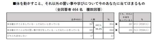 - 身体を動かすことをしている(してみたい)人の67.3%、それ以外の習い事や学びをしている(してみたい)人の71.3%と多くの方が、お金を払ってアクティビティを行っている。