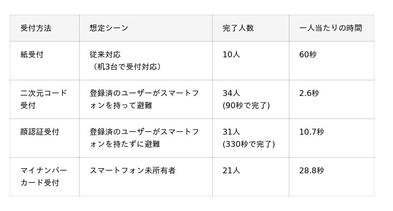 避難者の受付時間は従来の紙対応と比べて、それぞれの受付方法で大幅に短縮した結果が得られ、複数人が同時に受付できることで大幅な受付時間短縮となりました。