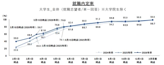 3月卒業時点の大学生(大学院生除く)の就職内定率※1は98.7%(-0.1ポイント)※2、進路確定率は96.4%(+0.6ポイント)で前年同水準の結果となりました。2026年卒の就職活動を振り返ります。民間企業への就職確定者に初めて選考(本選考における面接)を受けた時期を聞くと、2025年卒では卒業年前年1・3月が各14.2%でピークでしたが、2026年卒では卒業年前々年12月が16.1%で最も高くなりました。また、卒業年前年2月までの累計は78.3%(+5.4ポイント)、卒業年前年5月までの累計は9割を超え、政府が定める就職活動日程ルールと実態が大きく乖離していることも分かります。初めて内定を取得した時期については、卒業年前年2月までの累計が49.1%(+8.8ポイント)となり、企業の内定出しのスケジュールも一層早期化しているようです。就職活動を終えた感想を聞くと、「早めに始めておくべきだったと思う」という早期化に対する声のほか、「自分自身を見つめ直すきっかけになったり、人生観を考える機会になり、人としても成長できた」「いろんな業界や企業を知ることで、社会勉強ができる貴重な機会だと思う」など、自分自身や社会を知る良いきっかけになったという声も聞かれました。2026年卒の皆さんには、就職活動を通じて得た学びや気付きを、春から始まる社会人生活にぜひ活かしていただければと思います。