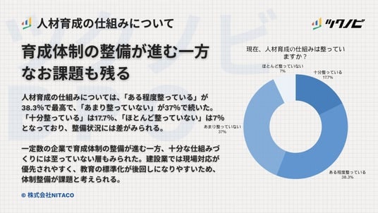 人材育成の仕組みについては、「ある程度整っている」が38.3%で最も高く、「あまり整っていない」が37%で続きました。「十分整っている」は17.7%、「ほとんど整っていない」は7%となっており、整備状況には差がみられます。