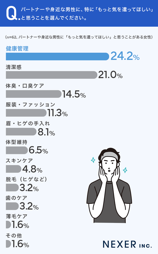 次いで「清潔感」21.0%、「体臭・口臭ケア」14.5%、「服装・ファッション」11.3%、「眉・ヒゲの手入れ」8.1%と続きます。
