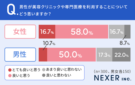 最後に、全国の50代以下の男女300名に、男性が美容クリニックや専門医療を利用することについてどう思うかを男女別に聞いてみました。