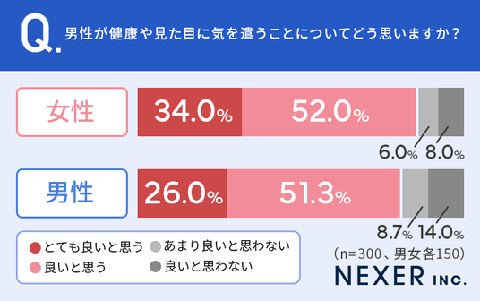 まず、全国の50代以下の男女300名に、男性が健康や見た目に気を遣うことについてどう思うかを男女別に聞いてみました。