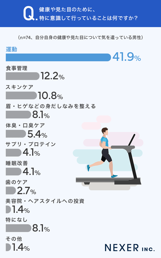 次いで「食事管理」が12.2%、「スキンケア」が10.8%、「眉・ヒゲなどの身だしなみを整える」が8.1%、「体臭・口臭ケア」が5.4%と続きました。