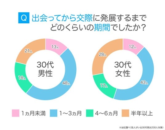 20代では3ヶ月以内が127人(63.50%)となり、比較的短期間で交際に発展している傾向が見られました。