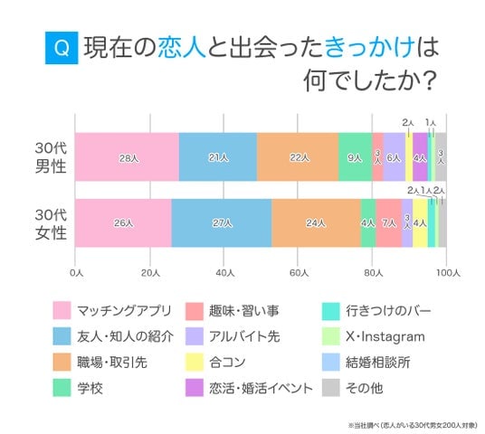 2.30代の出会いのきっかけ最多は「マッチングアプリ」(恋人がいる30代:200人)