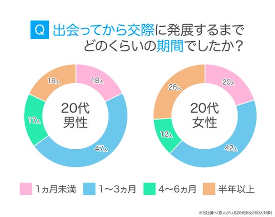 男女合計では200人中108人(54.00%)が「3ヶ月以内」に交際へ発展している一方、「4~6ヶ月」および「半年以上」を合わせると92人(46.00%)にのぼりました。