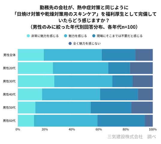 Q4-1:勤務先の会社が、熱中症対策と同じように「日焼け対策や乾燥対策用のスキンケア」を福利厚生として完備していたらどう感じますか?(男性のみに絞った年代別回答分布、各年代n=100)