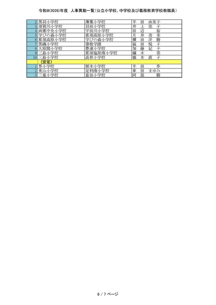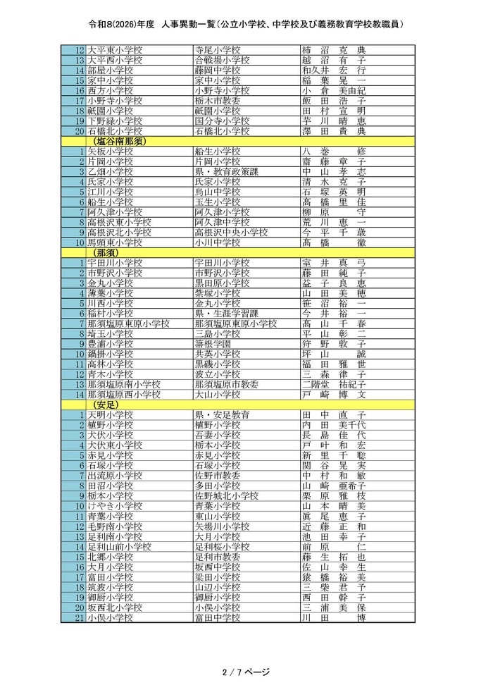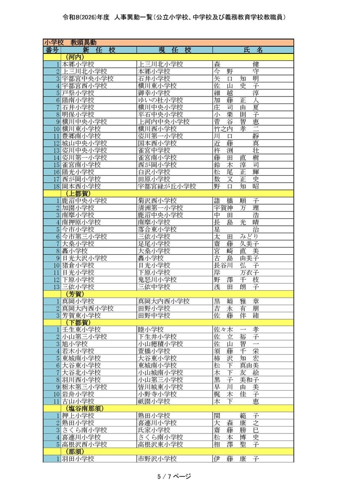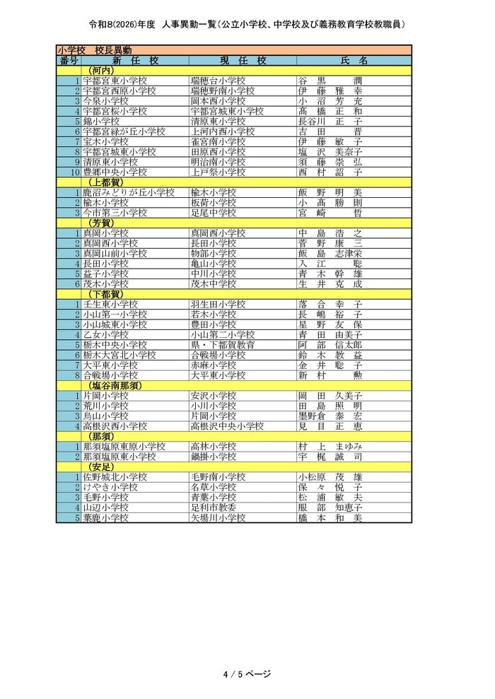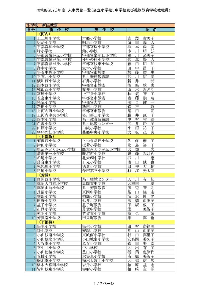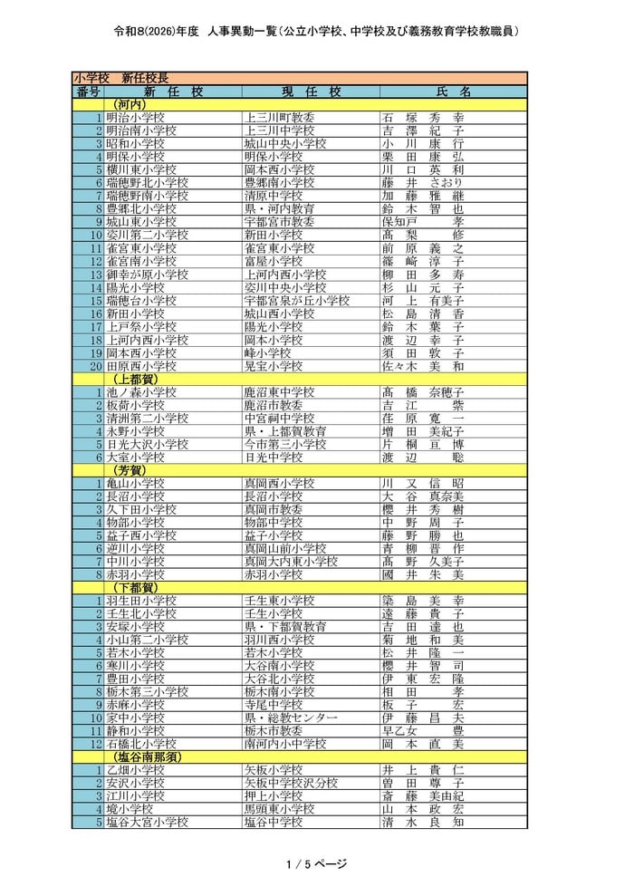 栃木県は4月1日付の公立小学校の教職員人事異動を発表した。