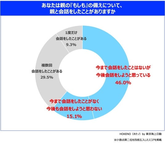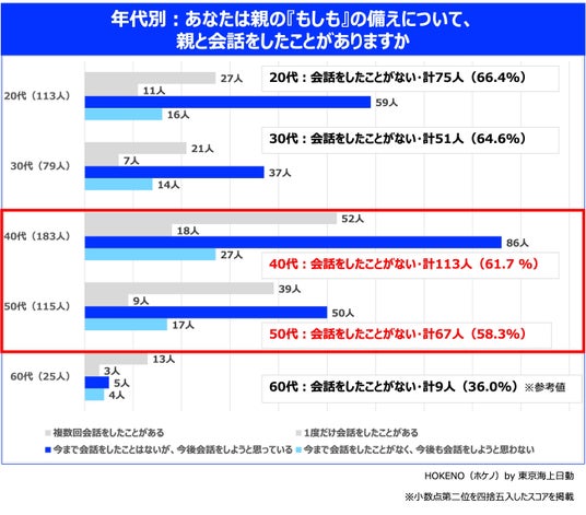 いつかはと思いつつ、大切な親だからこそ後回しにしてしまう『もしも』の話。保険総合ポータルサイト「HOKENO」を運営する東京海上日動火災保険株式会社は、20代~60代の男女1030人(親の看取り経験者・未経験者 各515人)を対象に「親の『もしも』に対する備え」に関する調査を実施しました。調査の結果、未経験者の約6割が今まで『もしも』の会話をしたことがないという実態が判明しました。また、約半数が『もしも』の話をすることに躊躇しており、その背景には「親の気分を害してしまいそう」、「ネガティブな気持ちにさせてしまいそう」という不安があることが明らかになりました。