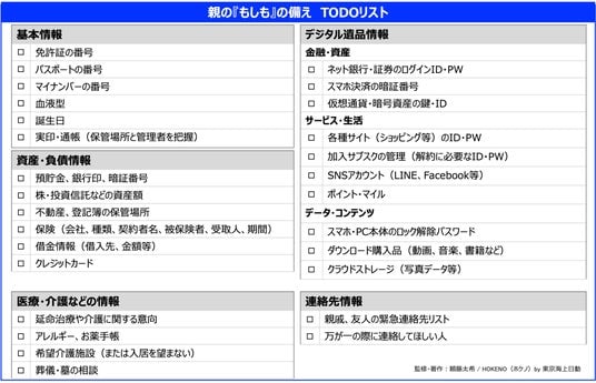 お金のことを聞くのは難しいもの。なんとなく聞いても、はぐらかしたり、教えてくれなかったりします。しかし、重要なのは、「自分が遺された時にどうなるか」という子の視点を親に正直に伝えることです。葬儀や墓のことはもちろんですが、相続のことも決めておかないと後々に遺族の中で争いの元になりますし、どこにいくら資産があるのか、残された側が把握していなければ、時間と手間がかかります。相続で受け取れる資産があるのか、葬式に充てられる資産が残っているのかどうかは多くの遺族が直面する切実な懸念事項です。このギャップを埋めるには、親世代に対し「子がどのような状況に置かれるか」を想像してもらい、終活を自分ごととして捉えてもらう働きかけが有効です。親世代もかつて祖父母(子から見て)の相続を経験したことがあるはずですので、以下のようなTODOリストを一緒に埋めていくことから始めてみましょう。
