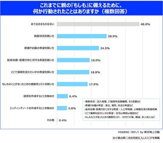 その一方で、備えのために何か行動したことがあるか質問したところ、「あてはまるものはない(48.0%)」を除く半数以上の人が、何かしらのアクションを起こしていることがわかりました。しかし、その具体的な内容を見ると、多い内容でも「資産状況を聞いた(28.9%)」、「葬儀やお墓の希望を聞いた(24.5%)」など、それぞれ3割未満に留まっています。さらに、「延命治療・医療方針の希望を聞いた(19.0%)」、「どこで最期を迎えたいかの希望(18.8%)」、「もしものことがあった時の連絡リスト(17.9%)」などもそれぞれ2割弱となっており、何かしらの行動はしつつも、深い対話や詳細な準備までは至らず、「いつかやろう」と先送りにしてしまっている実態が伺えます。