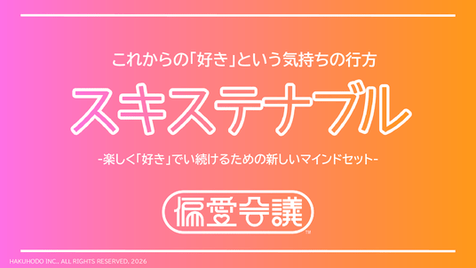 株式会社博報堂(本社:東京都港区、代表取締役社長:名倉健司)の専門組織「生活者発想技術研究所」による研究プロジェクト「偏愛会議TM」は、研究レポート第一弾「これからの『好き』という気持ちの行方 スキステナブル-楽しく「好き」でい続けるための新しいマインドセット-」を公開しました。