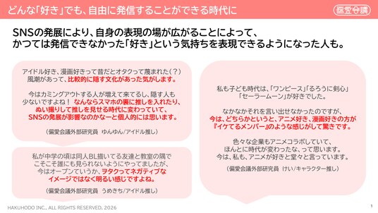 調査を通じて、生活者は推し活・オタ活を引き続き楽しむ一方で、社会に幅広く浸透したがゆえの悩みや不安も抱えており、企業がそうした変化に対応しきれていない状況も見えてきました。偏愛会議では、生活者研究を専門とする発想技研の研究員による客観的な調査分析に加え、多様なジャンル(アイドル、音楽、アニメ、キャラクター、スポーツ等)に強い「好き」を持つ100名以上の外部研究員との協働を掛け合わせることで、従来の調査だけでは捉えきれないリアリティのある解説や、企業がどのように生活者と向き合っていくべきかについての提言を行ってまいります。
