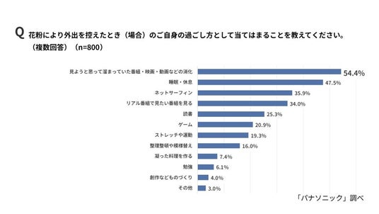花粉により外出を控えたときの自宅での過ごし方を聞いたところ、「見ようと思って溜まっていた番組・映画・動画などの消化」が54.4%で最多となりました。花粉で外出を避ける状況を逆手に取り、忙しさから見られずに溜まったコンテンツを心ゆくまで楽しむ「絶好の機会」へと転換し、有意義に活用している様子が見て取れます。